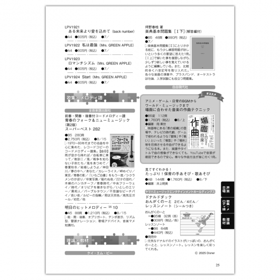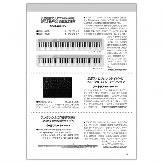 巻頭特集ページではミュージシャンの素顔に迫るインタビューをメインに、楽器に関する旬な話題を取り上げます。楽器の新製品ニュース、楽譜の新刊案内、音楽雑誌30誌前後の毎月の目次を紹介するほか、本誌でしか読むことのできない連載など、音楽・楽器愛好者のための情報誌です。