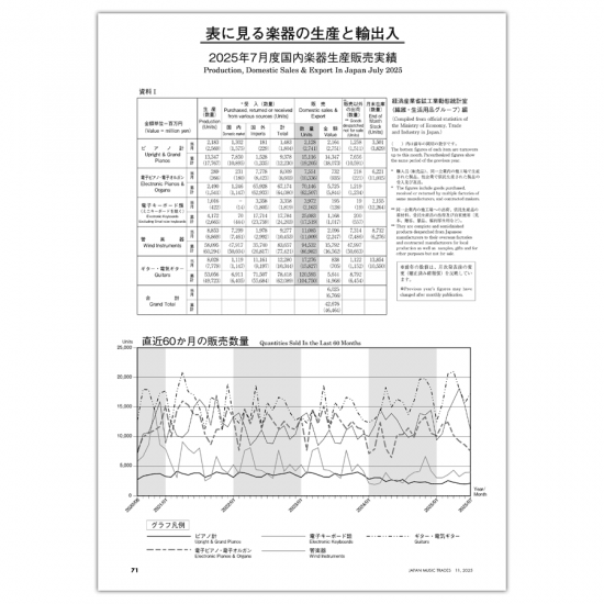 毎月タイムリーな特集記事、話題の新製品、楽器の売れ筋情報、楽譜や音楽書籍のランキング、生産出荷統計(毎年4月号・9〜11月号頃に年間統計を掲載)、人事異動など鋭意取材掲載するとともに各種連載も設け、楽器業界に特化した情報と話題をお届けしています。